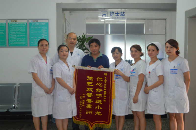 2013年8月26日,家住樂山市中區(qū)嘉州新城的射洪縣產(chǎn)婦宋春和女士的丈夫張先生,把一面寫有:“仁心妙手送小龍,德藝雙馨譽嘉州”的錦旗送到曾經(jīng)給予她們悉心照料的市婦幼保健院產(chǎn)科醫(yī)護(hù)人員手中。張先生激動地說:“原先產(chǎn)檢醫(yī)院的醫(yī)生說我愛人不好生,經(jīng)四處打聽,朋友介紹說你們醫(yī)院提倡自然分娩,鎮(zhèn)痛分娩又好,我們就來了。來到你們醫(yī)院后,經(jīng)過醫(yī)生的仔細(xì)檢查,護(hù)士的耐心講解,助產(chǎn)士的多方鼓勵,給了我們,尤其是我老婆分娩的信心,但橋英老師一直陪伴我老婆生,產(chǎn)后醫(yī)生護(hù)士對我們精心照顧,細(xì)心護(hù)理,產(chǎn)婦和寶寶都很好,今天回家了……真不知如何表達(dá)感激之情,贈錦旗深表謝意!”