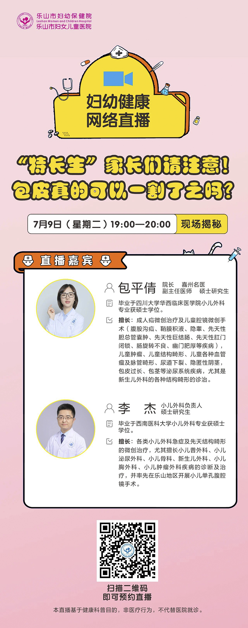 針對這些問題,7月9日19:00,樂山市婦幼保健院院長、嘉州名醫(yī)包平倩,小兒外科負責人李杰將做客直播間,為大家答疑解惑。