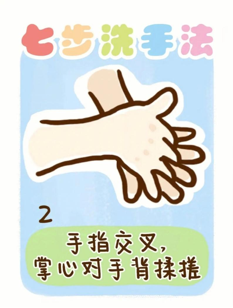 現(xiàn)在,一只手的手心去搓另一只手的手背,特別是那些手指縫隙里的地方,要仔細(xì)搓哦。然后,換另一只手來(lái)做同樣的動(dòng)作。這樣,我們的手背和指縫都能洗得干干凈凈。