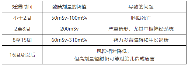 胎兒(胚胎)的最小影響劑量閾值是50mSv,理論上只要不超過這個(gè)數(shù)值就是安全的。