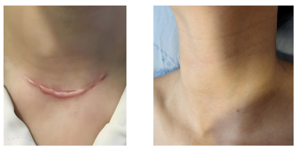 微創(chuàng)美觀:在確保治療效果的同時,顯著提升了美容效果。相較于傳統(tǒng)開放手術(shù)在頸部留下的6-8cm手術(shù)瘢痕,腔鏡甲狀腺手術(shù)將切口隱蔽于胸壁、腋下等部位,完美避免了頸部可見瘢痕的形成。