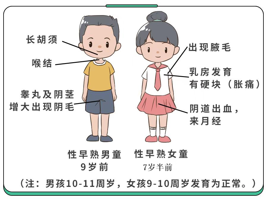 4、女孩子7歲半以前,男孩子9歲以前出現(xiàn)第二性征,女孩子10歲前月經(jīng)初潮,男孩子11歲前出現(xiàn)變聲、遺精的小朋友;