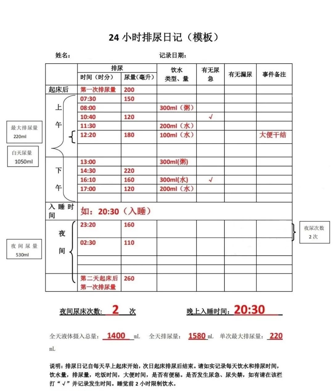 如果有任何不適,比如尿急、尿頻、漏尿等情況,也要記錄下來。例如:“8:30 - 排尿300ml,尿急。