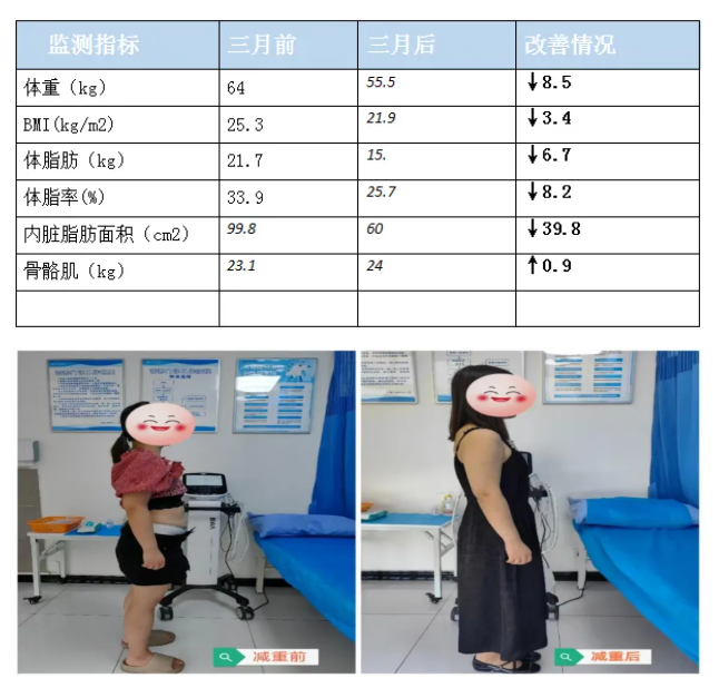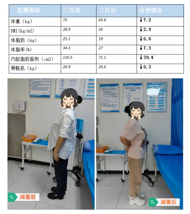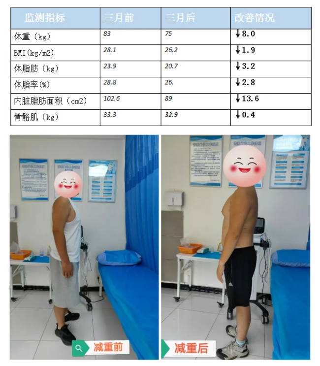 內(nèi)臟脂肪面積下降13.6cm2,肌肉流失率只有1.2%,遠低于普通減重肌肉流失率<25%標準, BMI從28.1→26.2,,從肥胖降為超重體型,體現(xiàn)了個性化方案大大改善了代謝核心指標,明顯降低了代謝性疾病風險,還望繼續(xù)加強無氧運動鍛煉,使體重回歸正常。