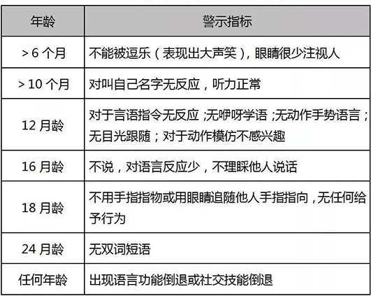 根據(jù)寶寶年齡,在表中查看對應(yīng)警示指標(biāo),如有相應(yīng)表現(xiàn),需考慮患有兒童孤獨癥。