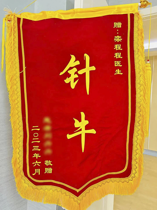 “我不知道如何表示感謝,千言萬語匯成兩個字‘針?! 薄涨?,我院中醫(yī)科負(fù)責(zé)人、執(zhí)業(yè)中醫(yī)師欒程程收到患者送來的一面別具特色的錦旗,錦旗上印著的“針?!倍质中涯?。這究竟是怎么回事?“針?!北澈笥钟兄鯓拥墓适履兀?