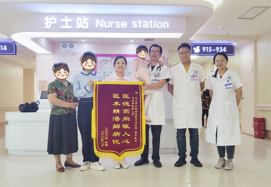 在我院兒科經(jīng)過抗病毒、降顱壓、營養(yǎng)支持等綜合治療后,小晞的病情很快便得到控制。為預(yù)防出現(xiàn)智力障礙、運動障礙等后遺癥,科室還有針對性地為孩子進行智力訓(xùn)練、康復(fù)運動等后期康復(fù)治療。經(jīng)過一個多星期的治療,小晞終于好轉(zhuǎn)出院。為表達對醫(yī)護人員的感激之情,小晞的父母便特意制作了一面錦旗表示感謝。