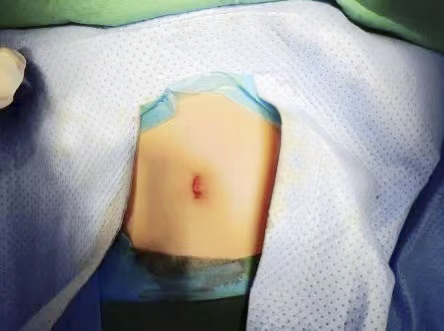 入院后,在婦科及麻醉科團隊的配合下,急診為悅悅在全麻下行單孔腹腔鏡探查術,術中發(fā)現(xiàn)左側卵巢巨大囊腫,直徑約16厘米,蒂部扭轉4圈,部分區(qū)域已明顯缺血,需立即行左側卵巢巨大囊腫蒂扭轉手術。術中手術醫(yī)生小心翼翼將囊腫一點點剝離下來,盡最大努力減少卵巢組織的損傷,及時保住了悅悅近壞死的卵巢,保留了孩子的生育功能。術前考慮到減少手術創(chuàng)傷,保持皮膚完整性,手術采用單孔腹腔鏡,術中盡可能將切口最小化,術后疼痛輕、體表美觀、毀損小、恢復快,術后當天即可下床。