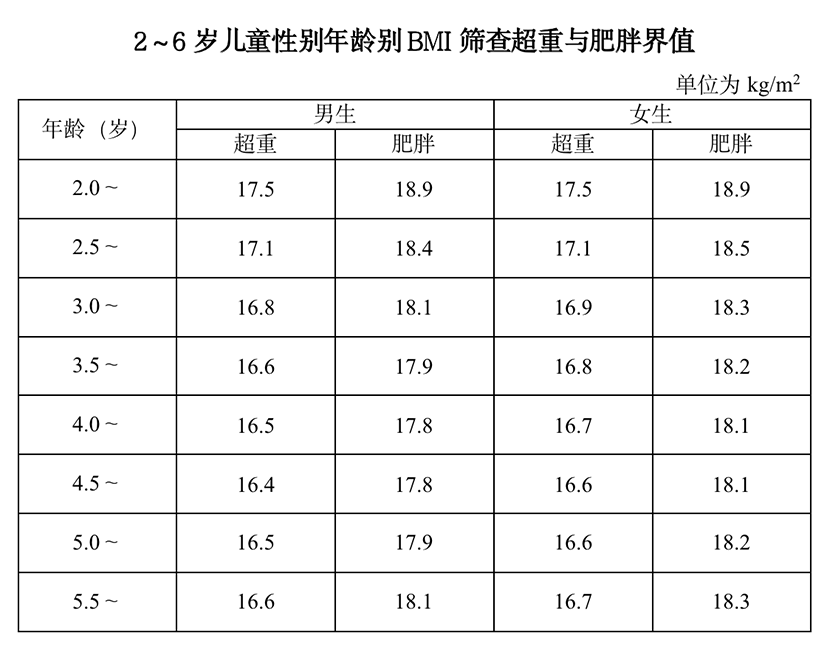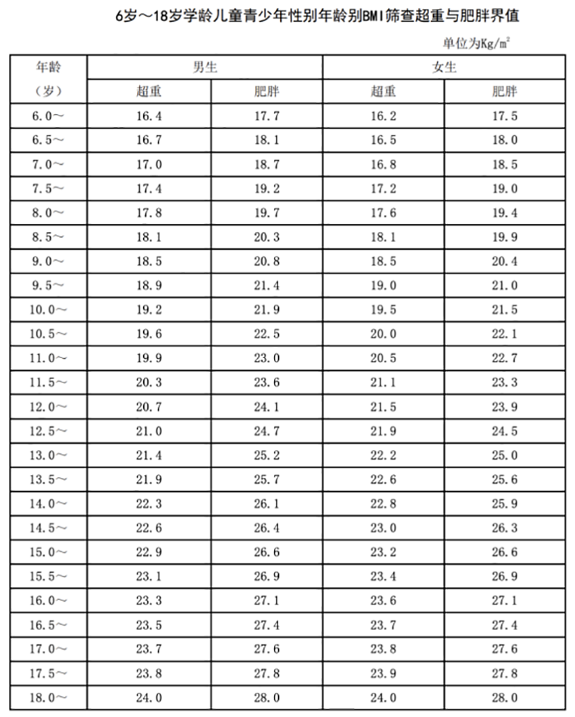 兒童肥胖評估可使用體重指數(shù)BMI初步評估,參考“兒童、青少年生長曲線”中的超重和肥胖BMI臨界點,體重指數(shù)BMI=體質(zhì)量(kg)/身高的平方(m2),BMI臨界點參考下圖: