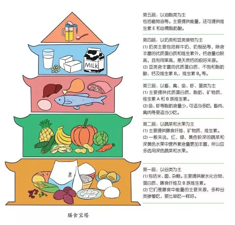 用以上膳食寶塔舉例,注重均衡營養(yǎng),食物多樣化,每天攝入12 種以上的食物,每周25 種以上。早餐應吃3種以上食物,進食蔬菜時最好有一半深色蔬菜。
