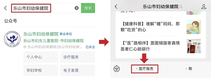 一、微信搜索“樂山市婦幼保健院”公眾號,點擊“醫(yī)療服務(wù)”。