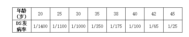 母親的生育年齡是唐氏綜合征已知的最主要風(fēng)險(xiǎn)因素,發(fā)病風(fēng)險(xiǎn)隨孕婦年齡增大而升高,具體的發(fā)病率見下表: