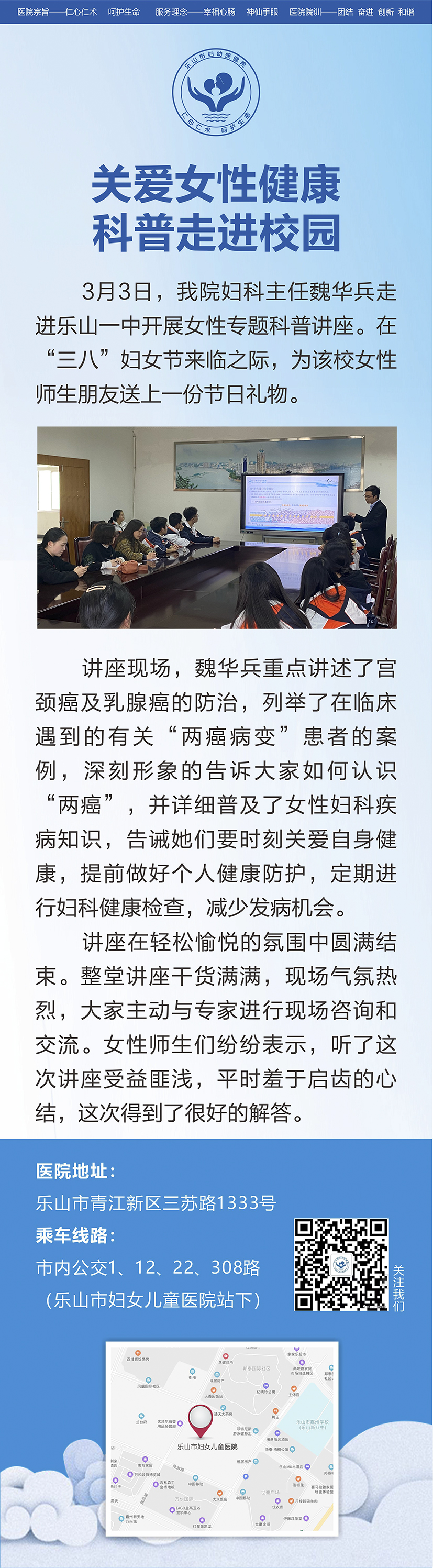 醫(yī)院地址:樂山市青江新區(qū)三蘇路1333號和瑞晗路1199號 乘車路線:市內(nèi)公交車1路、12路、22路、308路(樂山市婦女兒童醫(yī)院站下車)