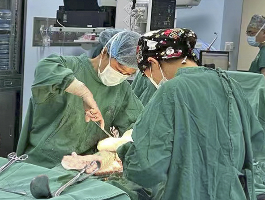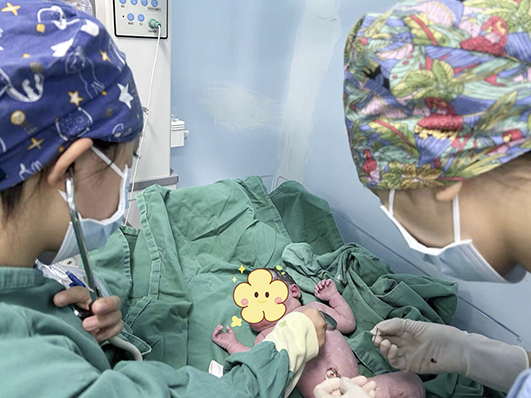 2023年5月25日早上08:16,大家正在為即將開始一天忙碌的工作做準備,樂山市婦幼保健院急診科電話鈴聲焦急的響起。一位36周+6天、臀位的孕婦向醫(yī)務人員求助,胎膜早破,羊水不停的流出來,她及家人不知所措。產(chǎn)科急診醫(yī)師汪潔剛到醫(yī)院,立馬叫上助產(chǎn)士,火速出診,路上通過保持通話安慰并指導孕婦平躺用枕頭把臀部抬高。順利到達孕婦家中經(jīng)初步檢查,孕婦臀位、胎膜已破、羊水清亮、胎心正常、宮口開大4+cm,并于陰道內捫及胎兒的雙足露于宮頸外口?!霸愀狻阆嚷丁?,汪潔醫(yī)生心里咯噔一下,一邊指揮大家迅速轉移產(chǎn)婦,一邊給科主任匯報。因小區(qū)電梯小,擔架不能進入,往日弱小的女醫(yī)生、護士們,拿出全身力氣,與家屬合力將孕婦抬入電梯,平穩(wěn)送上救護車。喻云倩主任接到電話后高度重視,立即聯(lián)系產(chǎn)科、麻醉科及新生兒當班醫(yī)生,讓大家立刻前往手術室待命,做好剖宮產(chǎn)及新生兒搶救的各項準備。孕婦到達醫(yī)院后立即通過綠色通道,直接進入手術室,因孕婦一直在我院產(chǎn)前檢查,院內留存孕婦全套產(chǎn)前檢查資料,早已守候的醫(yī)務人員,在充分準備下,順利為孕婦進行了剖宮產(chǎn)手術,伴隨新生兒第一聲洪亮的啼哭,在場的醫(yī)務人員終于松了一口氣。